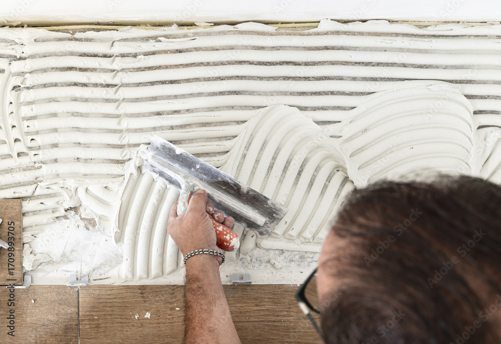 Craftsman spreads tile adhesive with trowel over a house floor, hand closeup. Construction process