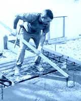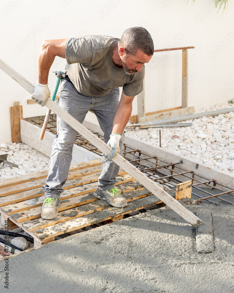 Worker in grey clothes spreading concrete floor during for construction of a new building