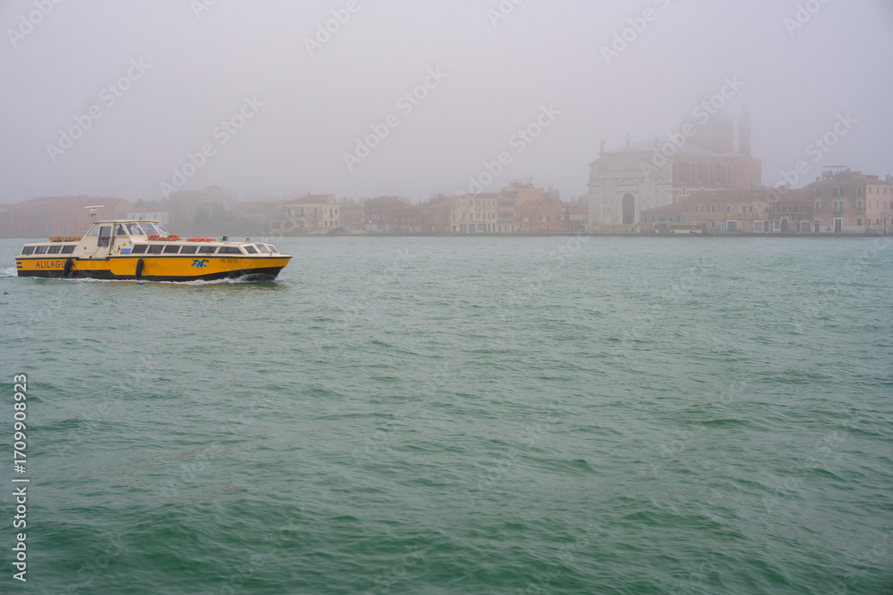 Venice's Alilaguna boat glides through fog on the Giudecca Canal