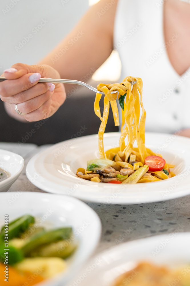 Close-up of a fork lifting fettuccine pasta with vegetables from a white plate. Casual dining scene with vibrant ingredients, ideal for culinary and lifestyle themes