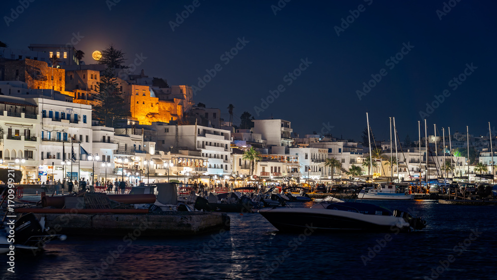Naxos, Greece - City centre illuminated at night with full moon in the sky