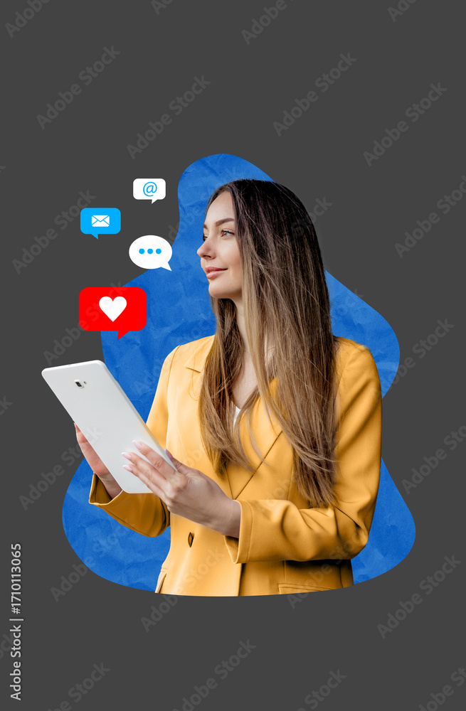 composite collage of a businesswoman holding a tablet with social media icons on a dark grey background
