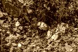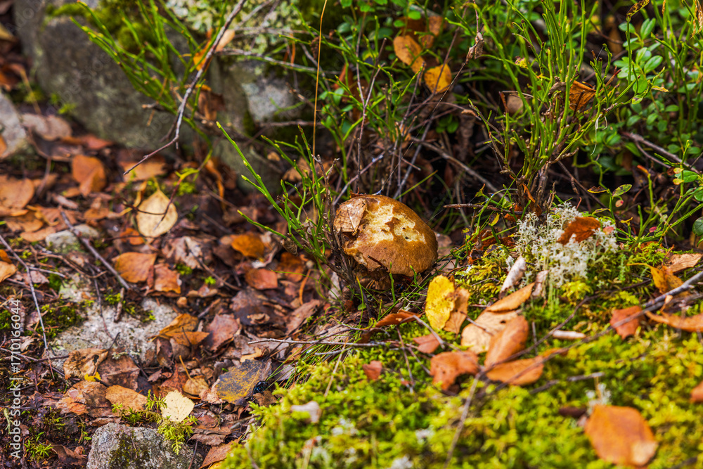 Close up view of birch bolete mushroom growing among dry autumn leaves moss and stones on forest ground. Sweden.