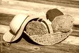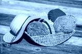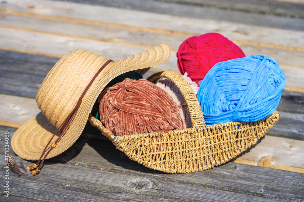 Colorful balls of wool in wicked basket