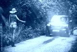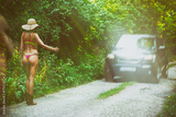 Hitchhiker woman in bikini on the road