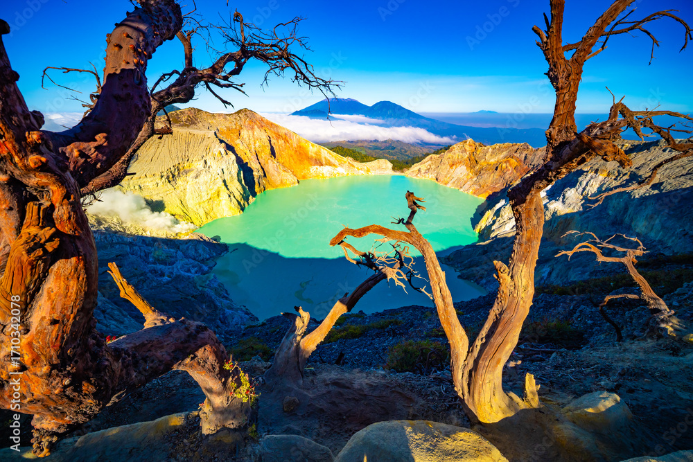 Aerial view of rock cliff at Kawah Ijen volcano with turquoise sulfur water lake at sunrise.Amazing nature landscape view at East Java, Indonesia. Natural landscape background