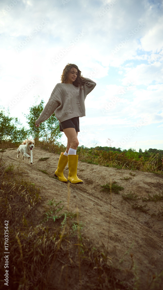 Woman walking downhill with dog in countryside wearing yellow boots. Concept of autumn lifestyle, pet companionship, freedom, health, and joyful activity outdoors.