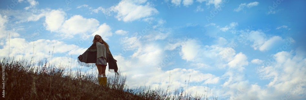 Woman standing on hill in yellow boots with arms wide open under sky. Concept of freedom, wellness, mindfulness, happiness, and lifestyle connection with nature. Banner