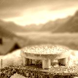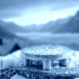 Wooden surface with empty copy space for product placement with frosty winter mountains covered in snow background. Concept of seasonal advertising, nature, winter holidays and outdoor lifestyle.