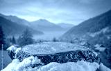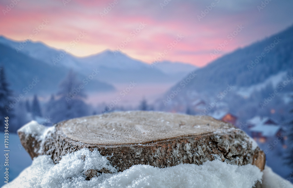 Wooden surface with empty copy space for product placement with frosty winter mountains covered in snow background. Concept of seasonal advertising, nature, winter holidays and outdoor lifestyle.