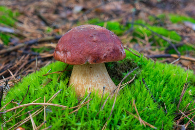 One porcini mushroom in green moss, pine forest.