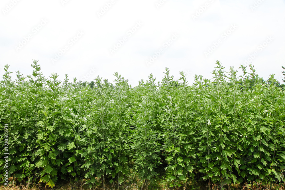 Large fresh mugwort plants with green leaves growing in agricultural fields for herbal medicine origin