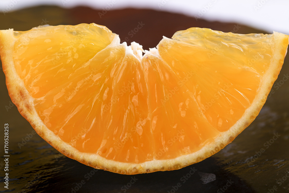 Fresh Orange Slice with Juicy Segments on Dark Wood Surface - Healthy Citrus Fruit Close-up