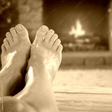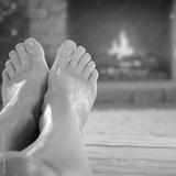 Close-up of feet resting near a warm fireplace, concept of winter holidays, Christmas time and the warmth of home. Symbol of comfort, relaxation and cozy atmosphere by the fire during cold season.
