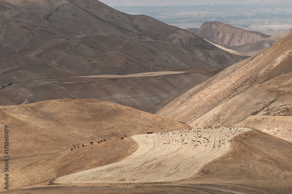 Bizarre hilly formations in Kyrgyzstan. Natural background of the earth's surface. Domestic cattle graze on mown fields on the hills.