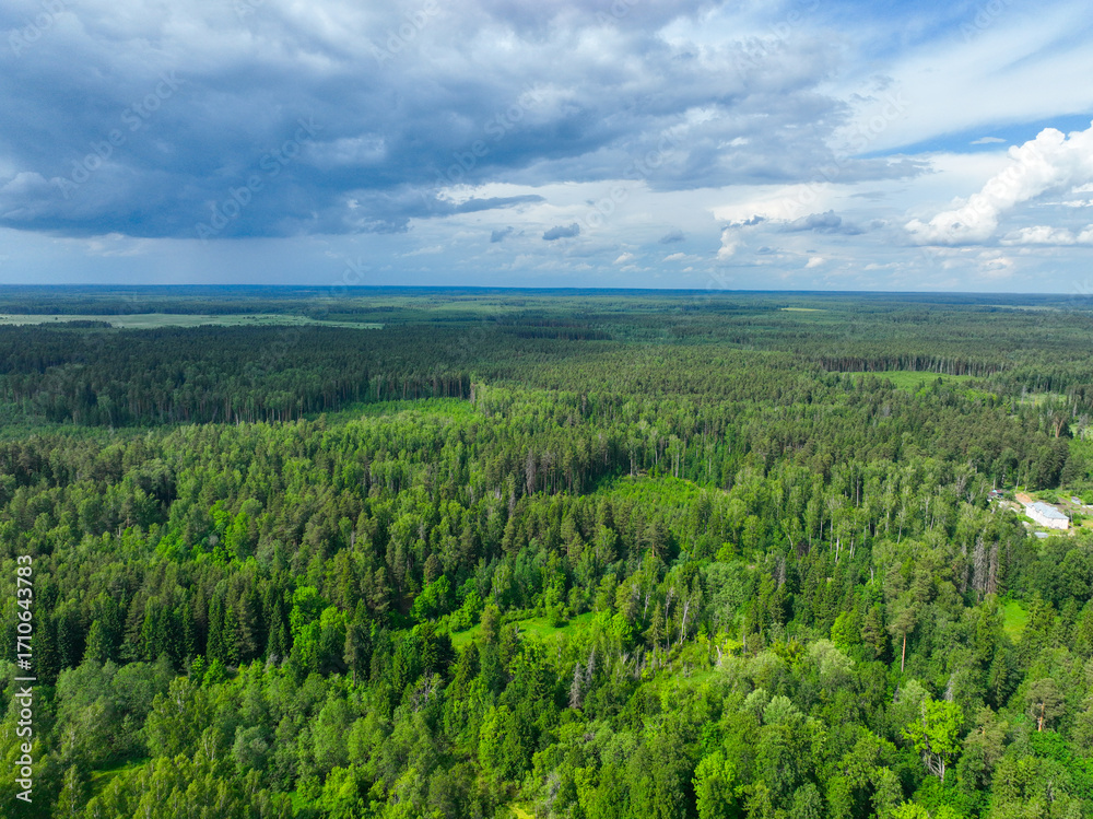A panoramic aerial shot of a vast, dense green forest stretching to the horizon under a dramatic, cloudy sky.