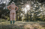 Woman in work overalls cleaning the garden during autumn season on sunny day. Seasonal concept of outdoor cleaning, gardening and autumn lifestyle activities.