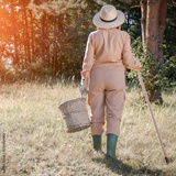Woman in work overalls cleaning the garden during autumn, raking fallen leaves on sunny day. Seasonal concept of outdoor cleaning, gardening and autumn lifestyle activities.