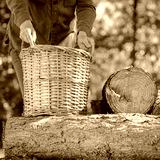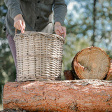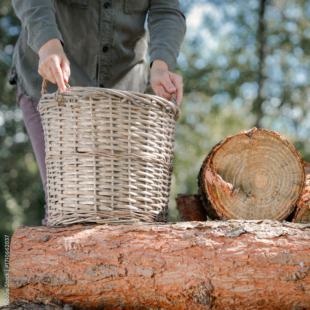 Chopped logs of wood prepared and gathered in the garden during a sunny autumn day. Concept of seasonal outdoor work, wood collection, garden cleaning, and preparing firewood for winter.
