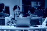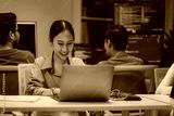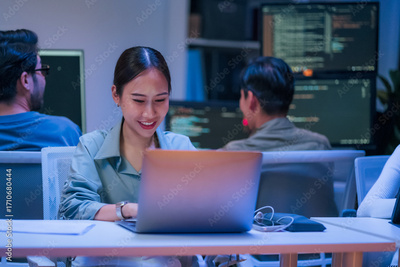 dedicated Asian businesswoman works late into the night in a dark modern office, focused on her laptop screen and occasionally yawning as she pushes through overtime hours