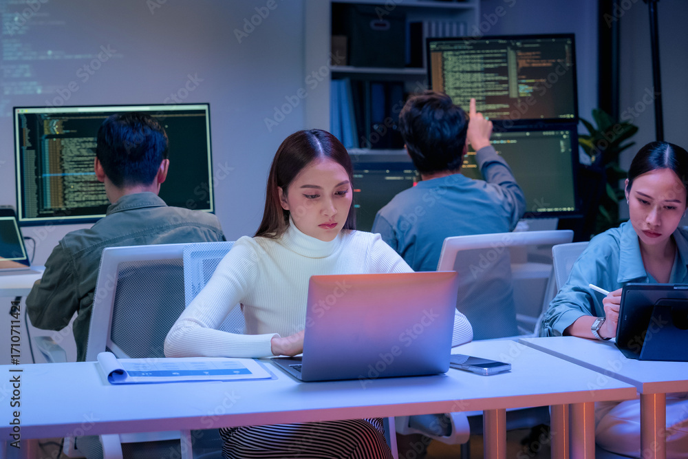 Asian programmer leverages generative AI assistance for deep learning and data driven analysis, optimizing a scalable, cloud native workflow in their modern, hyper automated smart office