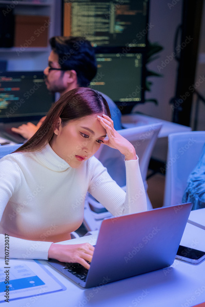 Asian programmer leverages generative AI assistance for deep learning and data driven analysis, optimizing a scalable, cloud native workflow in their modern, hyper automated smart office