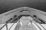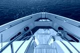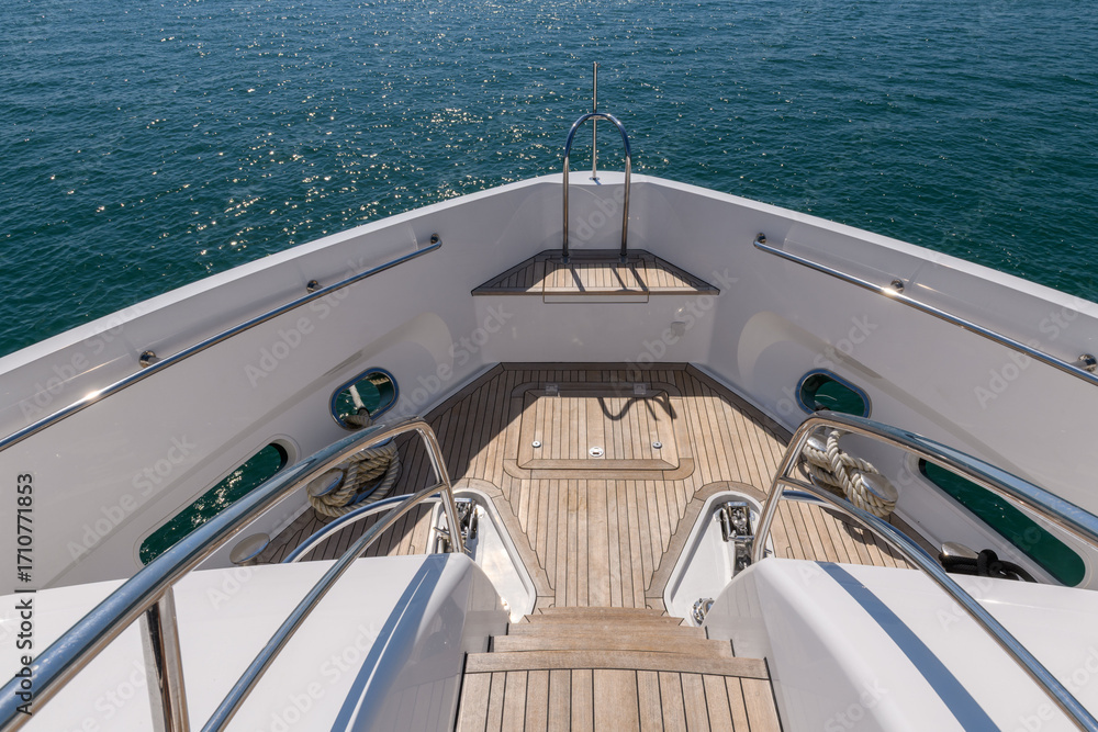 View from the bow deck of a modern luxury yacht with teak wood flooring, stainless steel railings, and nautical ropes. The yacht is sailing on calm blue sea, symbolizing travel