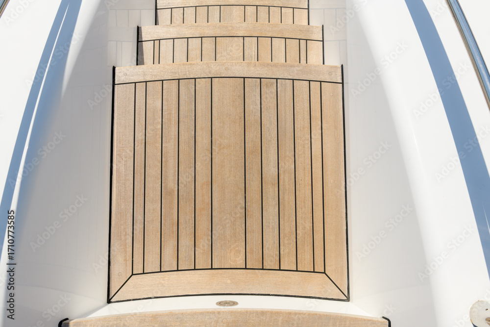Teak stairs ladder on luxury yacht. Elements of yacht construction. Superyacht concept.