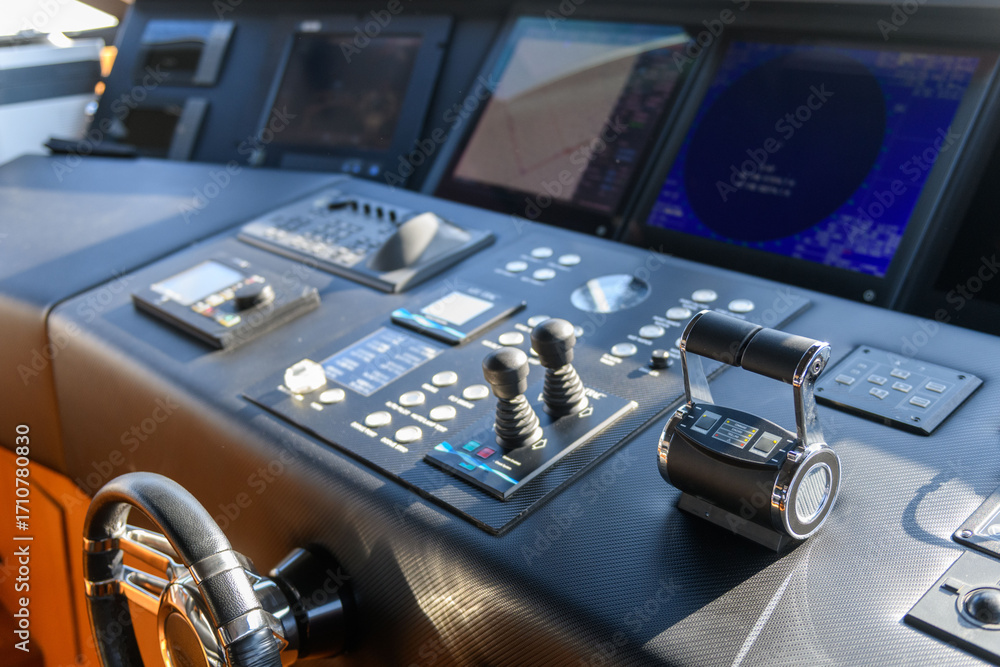 A close-up view of a yacht or ship bridge with the throttle controls. The navigation radar screen and electronic control panels are visible in the background