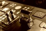 A close-up view of a yacht or ship bridge with the throttle controls. The navigation radar screen and electronic control panels are visible in the background