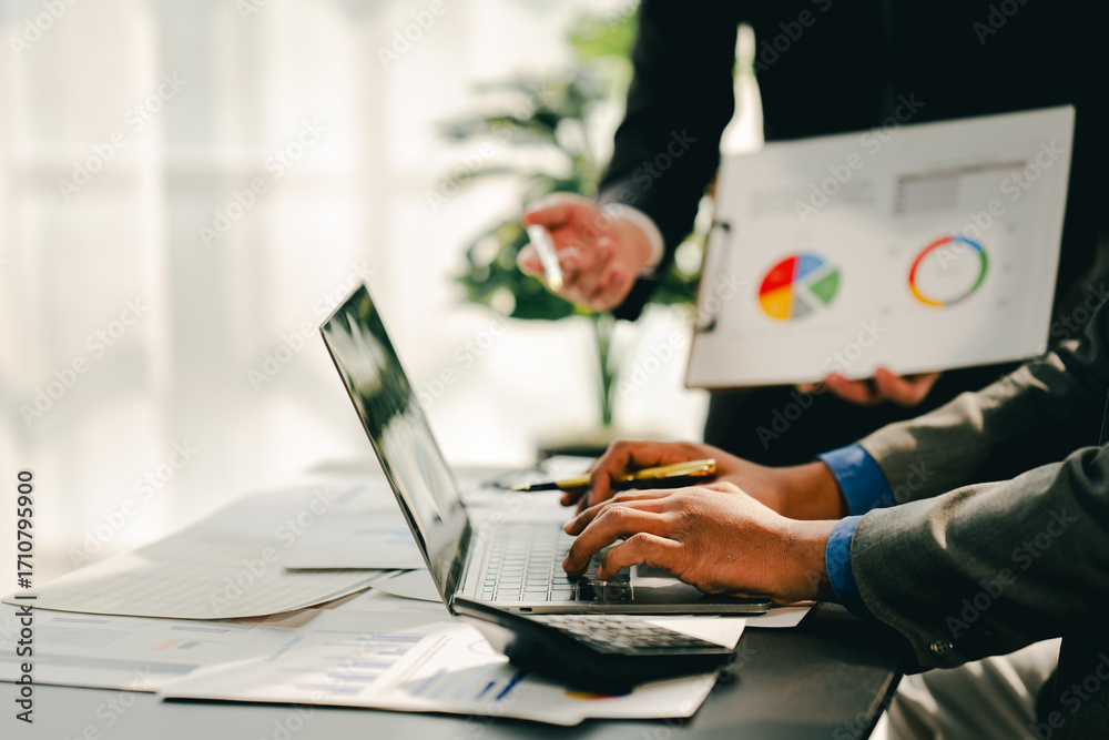 Young colleagues discussing business and price chart analyzes business people on the table great in modern coworking office teamwork concept. Calculate personal tax for customers