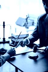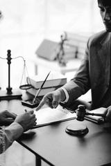 concept of justice and law A male judge in the courtroom on a wooden table and a male counselor or lawyer working in the office. Law, advice and justice concepts.