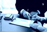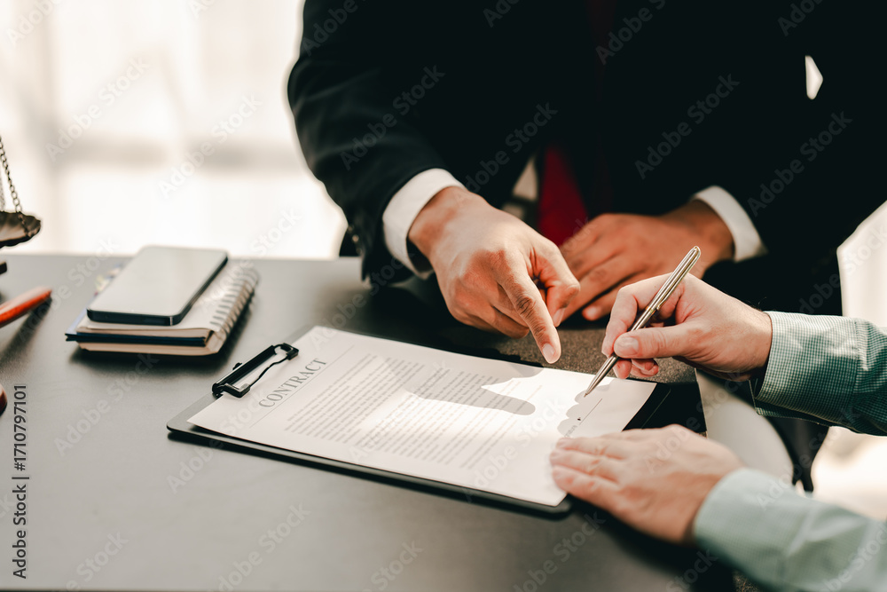 concept of justice and law A male judge in the courtroom on a wooden table and a male counselor or lawyer working in the office. Law, advice and justice concepts.