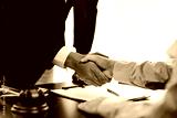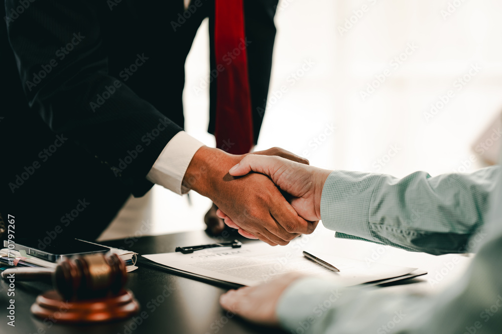 Portrait of lawyer in law office hand shake giving advice and advice on lawsuit consulting concept