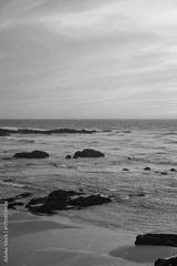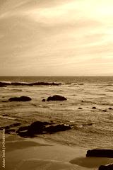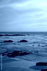 Rocky beach on the coast of Portugal. Waves, foam, pastel sky with pink and purple hues, peaceful scene, natural depth, sunset atmosphere.