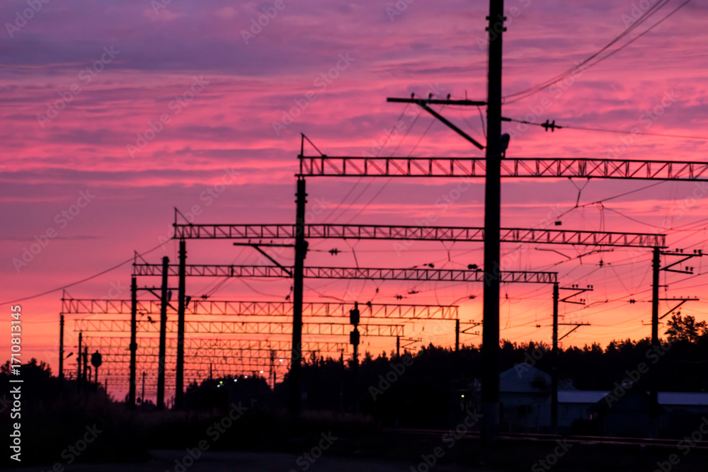 railway poles on the background of sunset. railway. farewell. colorful sunset. the railway infrastructure.