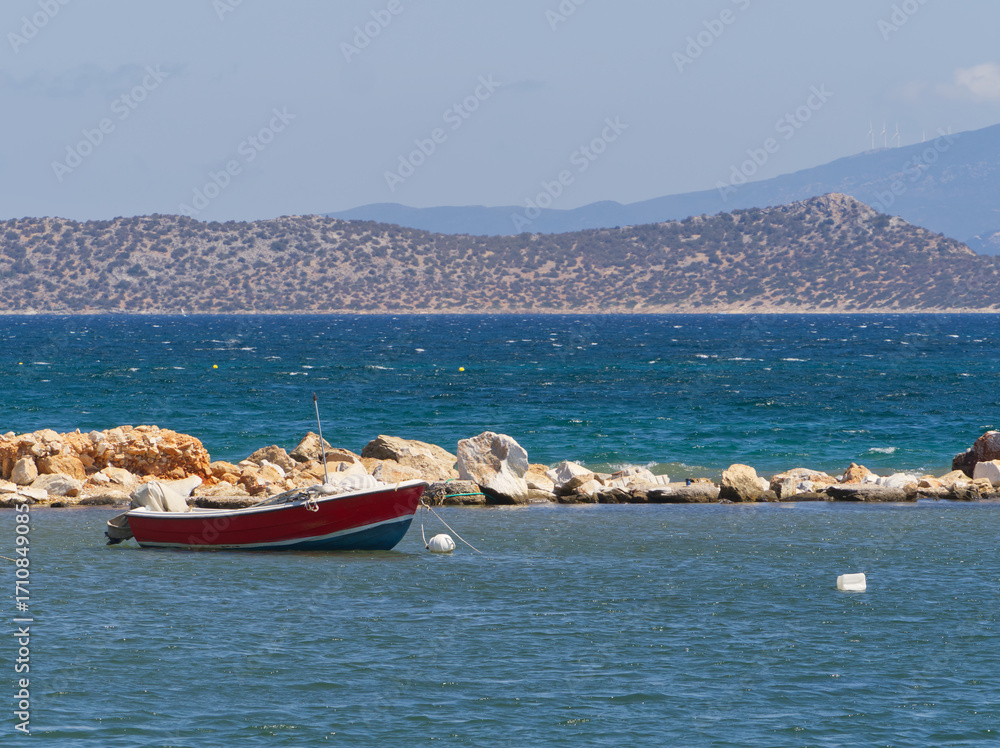 Traditional red and white fishing boat moored in calm Mediterranean waters with rocky coastline