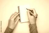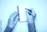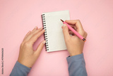 Female's hand writing in white blank open spiral notebook with pen on pastel pink background. Flat lay, copy space.