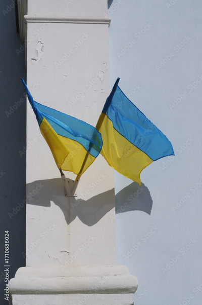 Ukrainian flags on the wall. National flag of Ukraine. Yellow-Blue flag.
