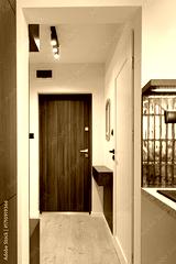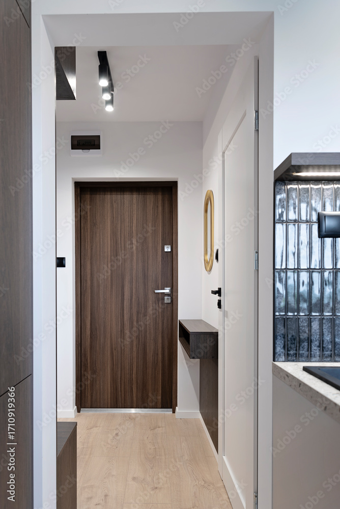 Modern interior of corridor in flat with wooden brown door and white wall and parquet on the floor. New apartment.