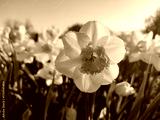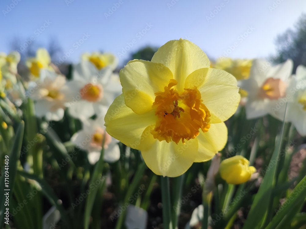 Blooming flower of the narcissus variety Modern Art close-up. Blooming daffodil flower with yellow orange petals in inflorescence on green stem with leaves growing in ground on sunny spring morning