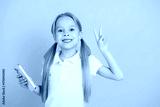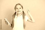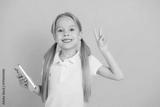 Happy young girl holding a phone and showing a peace sign on a vibrant yellow background, charming and cheerful