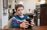 Young boy using smartphone at cafe, focusing on screen with serious face. Concept of digital lifestyle, technology in childhood, screen time, modern parenting, or mobile communication in public space