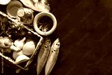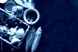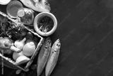 Mediterranean fish - dorado and vegetables on the chalkboard. top view