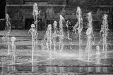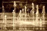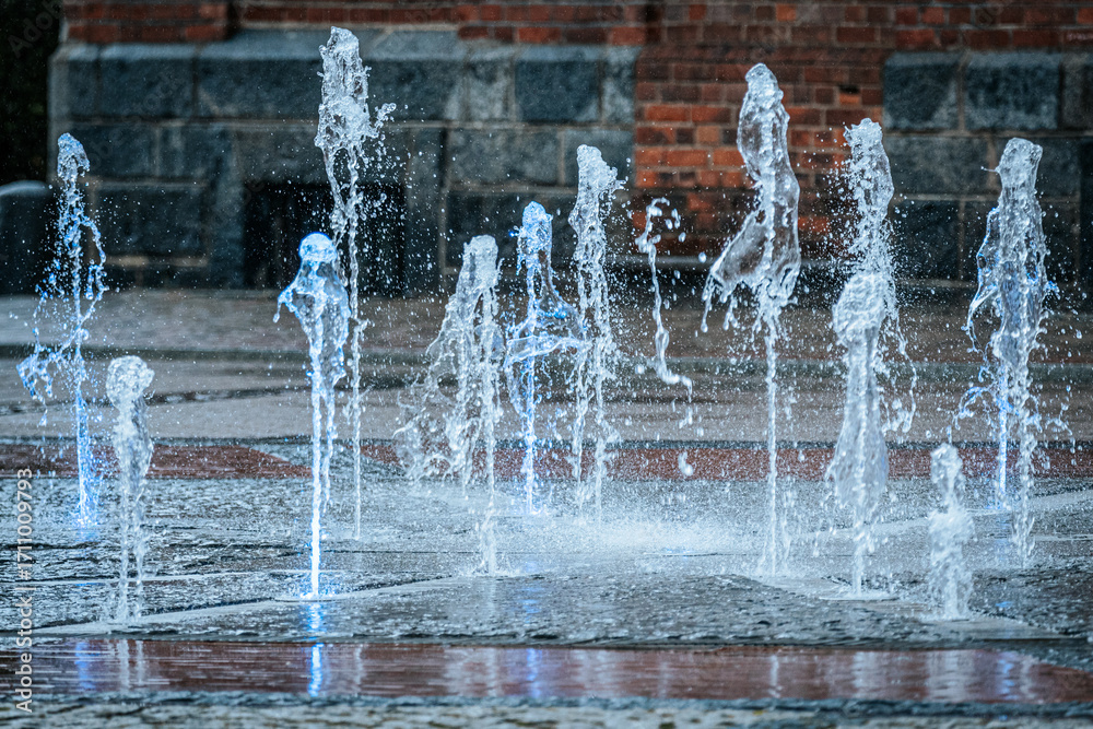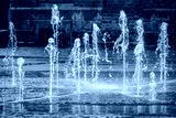 Jets of water shoot up from a ground fountain in front of a brick wall, lit by glowing blue lights, creating a dynamic and refreshing urban scene.