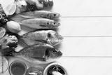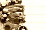 Fresh organic food - natural sea fish and veggies on the wooden surface