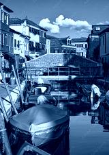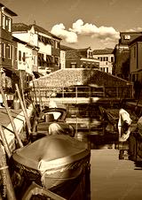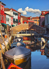 Burano island in Venice, Italy. Picturesque sunset over canal with boats among old colourful houses near old stone bridge between streets. Italia, popular travel destination.