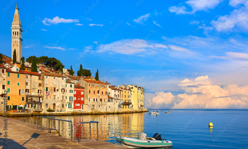 Rovinj, Istria, Croatia. Antique medieval houses and tower of Church of Saint Euphemia. Coastline of Adriatic sea. Sunrise with blue sky and sailing fishing boats on water. Calm silent summer morning.