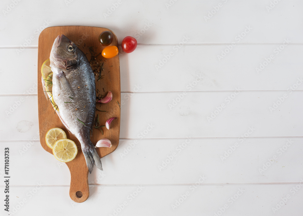 Mediterranean fish - dorado and vegetables on the chalkboard. top view