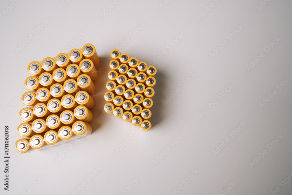Numerous double batteries arranged in two distinct groups on isolated white background, creating visually striking pattern while highlighting organized collection of energy sources, nobody, no people.